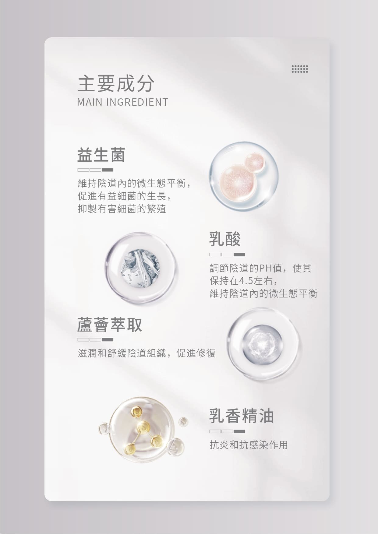- 溫合配方含有益生菌、乳酸、蘆薈萃取、複合精油 (乳香、薄荷、花梨木、杜松針)